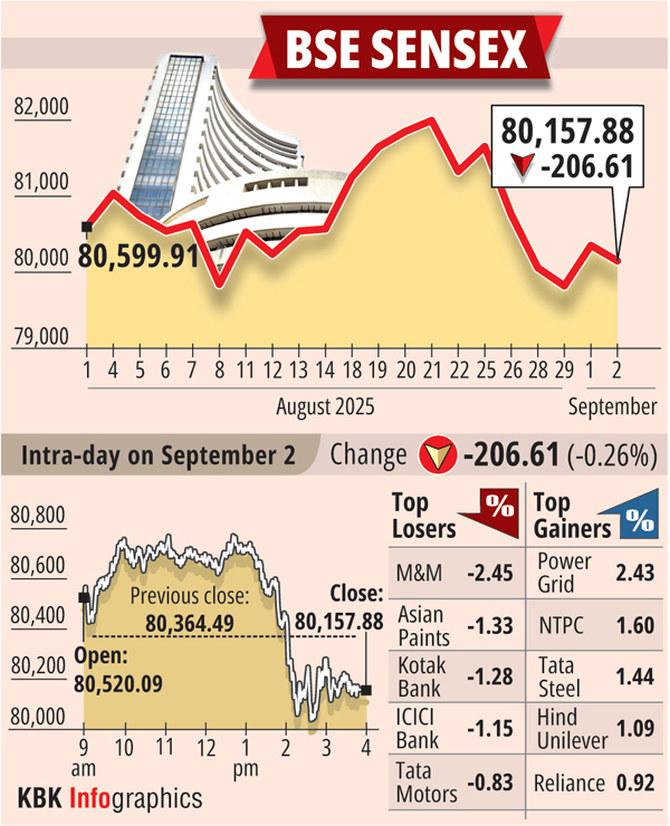 The 30-share BSE Sensex declined 206.61 points or 0.26 per cent to settle at 80,157.88.