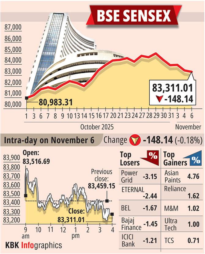 Falling for the second day in a row, the 30-share BSE Sensex declined 148.14 points or 0.18 per cent to settle at 83,311.01.