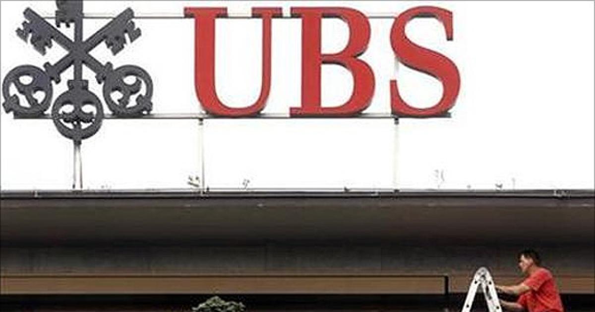 Image: A worker climbs on a ladder under the logo of Swiss bank UBS at the company's headquarters in Zurich. Photograph: Arnd Wiegmann/Reuters