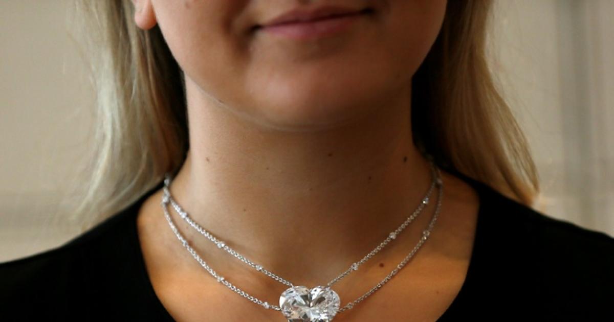 Image: A model wears a 50.05-carat heart-shaped D-Colour internally flawless diamond pendant. Photograph: Stefan Wermuth/Reuters. The image is used for representational purpose only.
