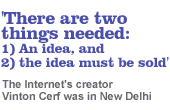 Cerf lacks the frazzled looks and abstracted air considered the trademark features of a quintessential nerd and spent some time facing an inquisition from Where do you think the Internet is heading? Well, they say a year in the Internet business is like a dog year -- equivalent to seven years in a regular person's life. In other words, it's evolving fast and faster. When we started in the early 70s, we were running the Internet at the speed of 50 KB per second. Thanks to the technological advances today we have a speed of 10 GB per second -- almost 1000 times better. And with new protocols coming in place we will be running at a speed of 40 GB per second in 2001. When I think about the Internet, I feel as if I'm living in a science fiction story. I have to pinch myself. What do you think will be the growth drivers of the Internet? There will be several growth drivers, of which the most significant will be the development of wireless access. This will mean the Internet becomes something like a telephone. You see, the telephone is never really switched off. Now when we have convergence of technology -- broadcasting, communication and information technology -- the Internet too will never be switched off. What this means is increased access. Another growth driver will be the development of infra-red communication, which will again increase speed of the Internet and also access. The third significant growth driver is the evolution of the servers. Today, we have developed a server with two chips, making the server size smaller than the plug that it is connected to. When the size decreases, along with the speed, the costs come down. This, in turn, will increase Internet access as more people will be able to afford it... Do you think TCP/IP will become a universal mode of communication? During the development of the Internet and its predecessor, Arpanet, most of the world understood the power of technology. We were very much focused on what we call 'Internet process communication' -- the interaction of software in different computers to accomplish a task. The absolute magnitude of the scale of the system wasn't apparent until the later 80s. Opinions differ but I consider that TCP/IP protocols are what makes the Internet it is... I think it will grow more ubiquitous and will grow massive in capacity. It will be able to differentiate services, so that low delay service, needed for telephony and video games, will be available. It will become far more mobile as radio-linked devices become IP-enabled. Can you tell us more about the IPv6 that you have developed? Well, to begin with it will be much faster. Today we have a 32-bit protocol, but version 6 will be a 128-bit protocol. This means that every molecule that make up human habitation on the earth can have an IP address. That is the size that this version will be able to provide. Everybody in India is very excited about the Internet and e-commerce. What is your reading of the market? In India, one thing that I have often heard is 'lack of infrastructure.' I do not agree with the philosophy that without infrastructure there is no future for e-commerce. Infrastructure is secondary on the net. I wish Indian cyberprenuers would look at opportunities outside the geographical borders. Even if you do not have infrastructure, there are countries that do, and you should able to exploit that. I visited Bangalore recently and am very impressed with some of innovative projects that netizens here have embarked on. I think there is a good lesson for the rest of the country here. What is your view on India's venture into Internet on cable? I have had some personal experiences on this here. And I am not disappointed. The Internet on cable is happening in India, but I want to remind you that there are other media that should be looked at. India should not rely on cable alone. Realistically, what kind of convergence do you see happening in India? Like I said, science fiction does not remain fiction for long. And certainly not on the Internet. We already have Internet-enabled cameras and cellphones. Back home we have developed an Internet-enabled toaster. I see more and more consumer goods getting Internet-enabled. In fact, somebody has developed kitchen equipment that is Internet-enabled. Now, the question can be: 'Why would anyone want an Internet-enabled microwave oven?' The point is that with an Internet-enabled microwave oven, the manufacturers can simply download a new programme into when the consumer wants to update his gizmo or solve a malfunction online. All these things are possible in India too. There are two things that are needed: one, an idea, and two, the idea must be sold. If these two factors are in place there will be someone out there to make it happen. Why, I think soon we will have clothes that can monitor the health of a person, or books that can update themselves. Well, I foresee one problem with such books -- if you have read it and liked a particular topic on page 236, when you go back to the book after its regular self-update you may not find the topic on that page! |