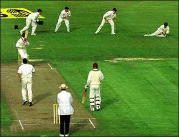 Cornhill Test - Day 1ONE FOR THE SLIPS: Brian Lara, who had a harrowing time right through his short innings, is unable to clear third slip Graham Thorpe off the bowling of Gough.Michael Steele/ALLSPORT BACK START |