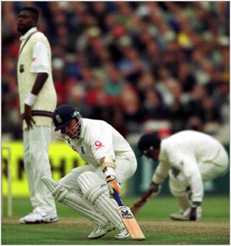 Cornhill Test - Day 2TOUCH DOWN: Curtly Ambrose looks on as Alec Stewart and Marcus Trescothick run between the wickets. The pair scored 179 at four runs an over, some accomplishment that considering the fact that they scored only three runs in the first ten overs.Laurence Griffiths/ALLSPORT BACK NEXT |
