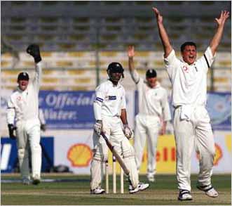 England bowler Darren Gough claims the wicket of Saeed Anwar in the third and final Test against Pakistan, at the National Stadium in Karachi, Pakistan.