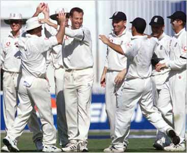 Marcus Trescothick is congratulated by his teamamtes after claiming the wicket of Imran Nazir.