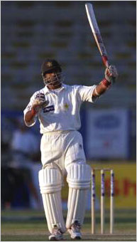 Yousuf Youhana acknowledges the applause from the stands after he reached his 100.