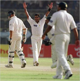 Waqar Younis rejoices after claiming the wicket of Marcus Trescothick.