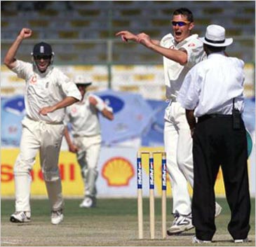 Ashley Giles and Marcus Trescothick rejoice as Salim Elahi goes.