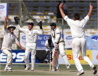 Ashley Giles celebrates along with Graham Thorpe and Alec Stewart at the fall of Abdur Razzaq's wicket.