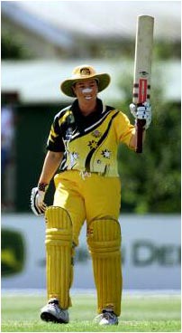 Karen Rolton celebrates reaching her century whilst scoring 107 not out.