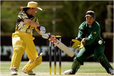 Karen Rolton gliding the ball pass the keeper on her way to an unbeaten 107.