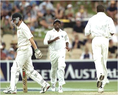 Even StevensThe stand-in Aussie captain Adam Gilchrist, didn't last too long in the middle. He was out for 6 falling to Nixon Mclean. At this point, the Aussie innings seemed to be in serious jeopardy, with only Damien Martyn and the tail still to come.Tony Lewis/ALLSPORT |