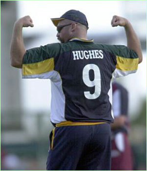 Merv Hughes, former Australian fast bowler making a comeback!! Not in your dreams. Merv was spotted showing his muscles to the crowd during the Ian Healy Testimonial Cricket match played between Ian Healy's Australian Eleven and the Rest of the World Eleven played at the Gabba in Brisbane, Australia.