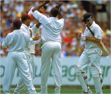 It's Waugh AgainThe West Indies celebrate the dismissal of opener Matthew Hayden, who was way below his best touch, struggling through the first hour before Courtney Walsh lifter took him out immediately after drinks. A hesitant forward push found the ball going to the keeper off the outer edge.Sean Garnsworthy/ALLSPORT |