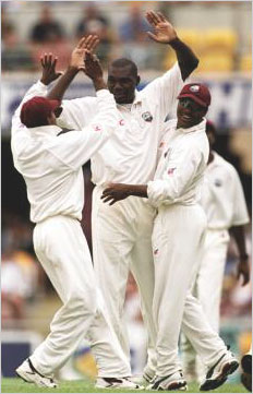 Aussies on topMarlon Black claims the wicket of Justin Langer caught by Ridley Jacobs for three.Nick Wilson/ALLSPORT Previous Next |