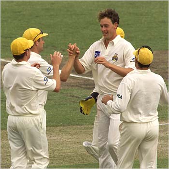 Matthew Nicholson of Western Australia celebrates with team-mates after claiming the wicket of Steve Elworthy of South Africa, caught by Marcus North for 29, during day one of the four-day tour match.