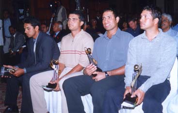 Rahul Dravid, Sourav Ganguly, VVS Laxman and Sachin Tendulkar at the Castrol Awards for Cricketing Excellence function, held at the Taj West End Hotel, Bangalore, on Monday, December 17, 2001.