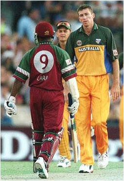 Brian Lara confronts Glenn McGrath and exchanges words during the first final.