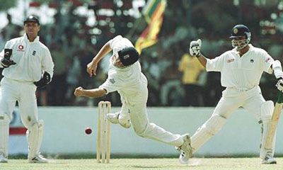 Marcus Trescothick makes a dive but just misses a catch off the batsman Marvan Attapattu.