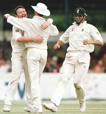 Robert Croft is congratulated by his teammates after taking the wicket of Kumar Sangakkara.