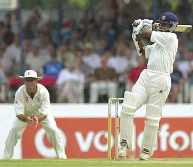 Kumar Sangakkara hits a four as Graeme Hick looks on.