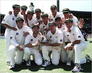 The spoils of victory are shared by all. A proud moment in the lives of all these cricketers. Behold the Frank Worrell trophy.