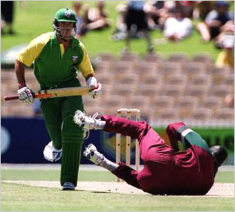 Greg Blewett of Australia A runs past Marlon Black as the West Indian bowler attempts to cut off the run. Blewett scored just 15.