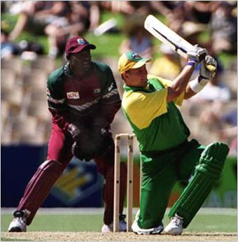 Shane Lee hits Mahendra Nagamootoo of the West Indies for six during his innings of 30. The batsman was later stumped by keeper Jacobs.