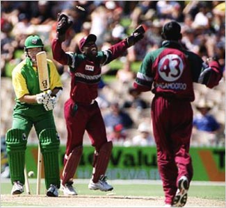 Wade Seccombe of Australia A is bowled for two by Mahendra Nagoomootoo.