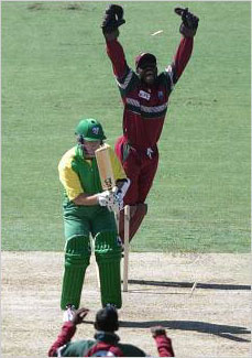 Wicketkeeper Ridley Jacobs rejoices as Stuart Macgill is bowled by Mahendra Nagamootoo for 1