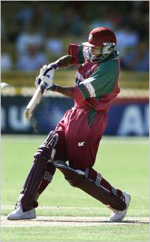 Brian Lara of the West Indies pulls a ball through mid-wicket region, during his brief stay at the wicket.
