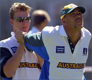 Brett Lee of Australia helps team mate Andrew Symonds stretch, during training at the Melbourne Cricket Ground, Melbourne, Australia.