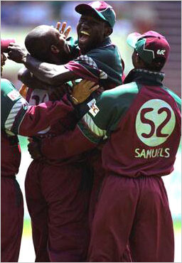 Aussies - Windies at the MCGWavell Hinds of the West Indies celebrates the wicket of Adam Gilchrist of Australia, in the Carlton One-Day International series between Australia and the West Indies, at the Melbourne Cricket Ground in Melbourne, Australia.Hamish Blair/ALLSPORT |