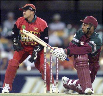 West Indies vs ZimbabweWest Indies captain Jimmy Adams sweeps during his innings of 24 as Andrew Flower looks on. Adams came out in a positive frame of mind and even hit a six behind the wicket-keepers head.Nick Wilson/ALLSPORT |