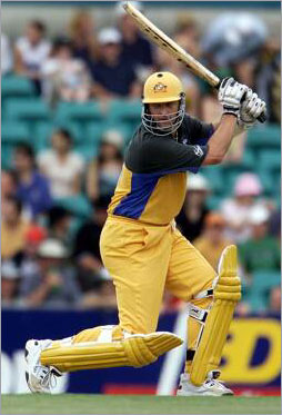 Mark Waugh miscues a drive and watches the ball go to point.