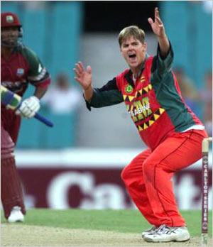 Bryan Strang gets the wicket of Brian Lara LBW, as Lara looks on dejectedly.