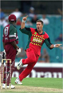 Heath Streak gets the wicket of Laurie Williams caught behind for naught.