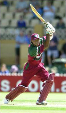 Marlon Samuels drives through cover point. He made 68 before being caught by Andy Flower off the bowling of Viljoen.