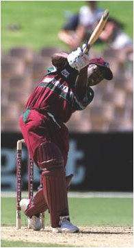 Brian Lara drives through mid-off during his innings of 70.