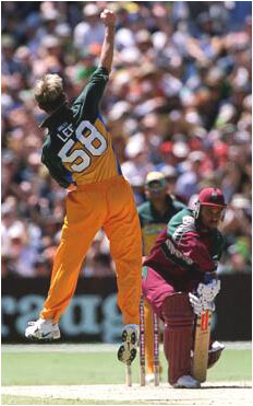Brett Lee celebrates yet again trapping skipper Jimmy Adams in front for four.