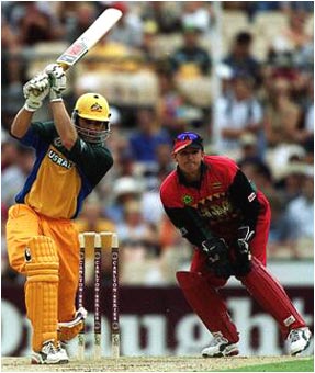 Adam Gilchrist drives through cover as wicketkeeper Andy Flower looks on.