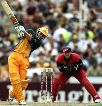 Michael Bevan drives through mid off during his innings of 74 not out as wicketkeeper Andy Flower looks on. He was later awarded the man of the match.