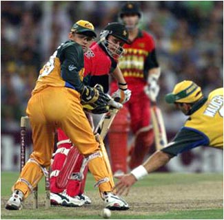 Grant Flower edges through first slip where Mark Waugh dives as Adam Gilchrist looks on.