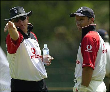 Duncan Fletcher, the England Coach, has a chat with Captain Nasser Hussain.