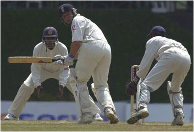 Robert Croft guides one down the leg side past wicketkeeper Sangakkara.