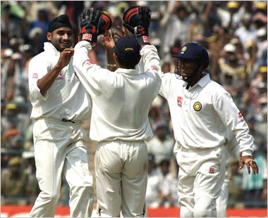 Slater stuck it out for a bit, then opted to try and hit the offie out of the attack, going down the track and smacking him over midwicket for a huge six. Harbajan responded with a ball that had a bit more overspin than usual, bringing Slater forward and getting the extra bounce and turn to take the thick inside edge through to Ganguly at leg slip.
