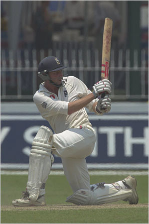 Opener Michael Atherton sweeps the ball as England begin their first innings on day 2. Atherton made 21 off 60 balls.