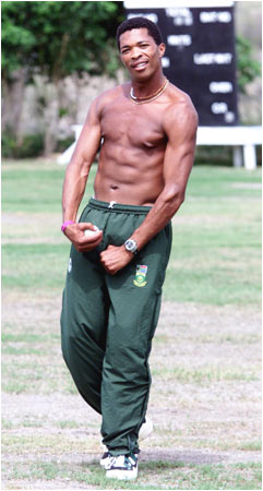 Makhaya Ntini poses for the camera during a practice session.