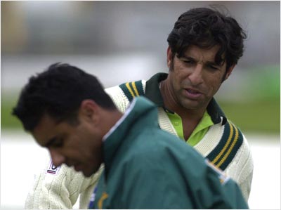 Pakistan skipper Waqar Younis (left) and former skipper Wasim Akram during a net session at Trent Bridge, Nottingham.