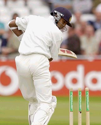 India opener Wasim Jaffer looks behind to find his stumps shattered, bowled by Matthew Hoggard on day 1 of the second Test against England, at Trent Bridge, Nottingham.